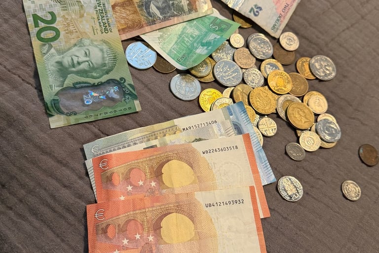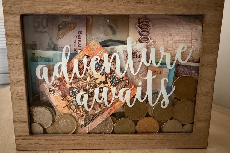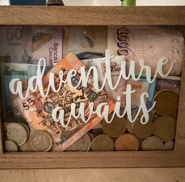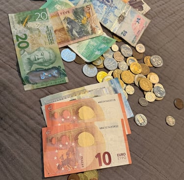 Every bill in that shadow box is a story. The euros from my first solo trip to Europe. The coins from a country I can barely pronounce now but will never forget. The crumpled notes I shoved in my pocket after paying for something extraordinary in a place that changed me a little. They're not perfectly displayed. They're not organized by denomination or country or date. But they're mine, and they're real, and every single one of them meant something when I had it in my hand.